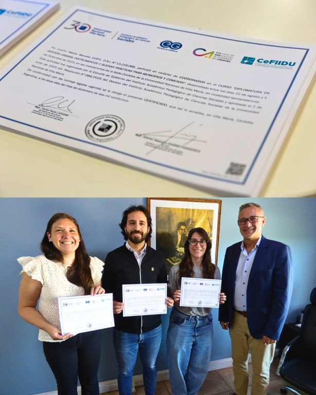 La Municipalidad de Salsipuedes, a través de su Intendente, Dr. David Strasorier, se enorgullece en felicitar al equipo de profesionales integrado por Aylen Achaval, Agustín Martínez y Pamela Benokovich, por su reciente graduación en la prestigiosa Diplomatura en Gestión Urbana. Esta formación, resultado de un valioso trabajo interinstitucional, refuerza el compromiso de nuestra gestión con el desarrollo y la planificación estratégica de la ciudad.